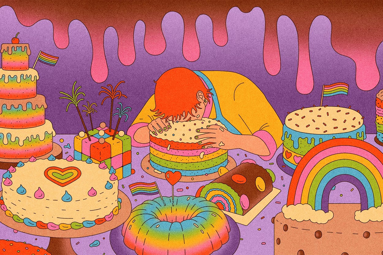 Adriann Ramirez on the tyranny of rainbow cakes and corporate Pride for queer bakers. Illustration by Gabriel Mafféïs