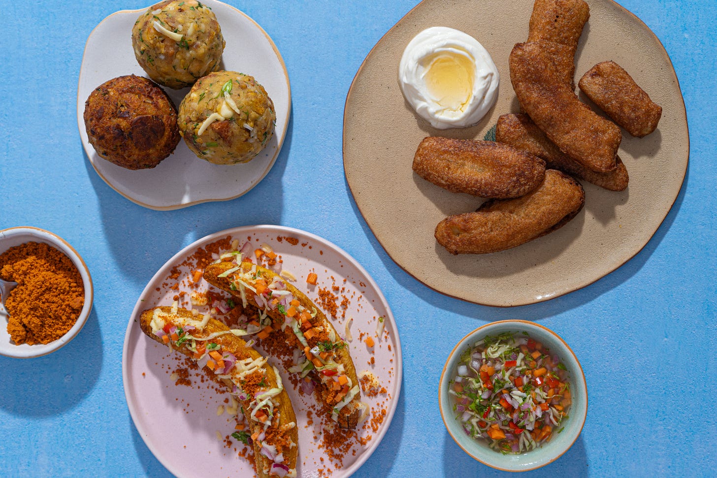 I turn to three of the simplest, most joyful expressions of banana-based Ecuadorian cooking: maduros con queso, sal prieta y encurtido manaba (whole ripe plantains stuffed with cheese, peanuts and a spicy salsa); bolones de verde (mashed green plantain balls packed with porky chicharrón and hot sauce); and, to finish, emborrajados de guineo (crispy banana fritters) served with a spoonful of yoghurt and a drizzle of honey. These are the kind of recipes that work for breakfast, lunch, dinner or anytime in between. They move easily between savoury and sweet, with hints of acidity and spiciness from the sauces that go with them. When I cook these recipes, I imagine a version of my country that isn’t unravelling, one I hope can exist and that I can meet again.