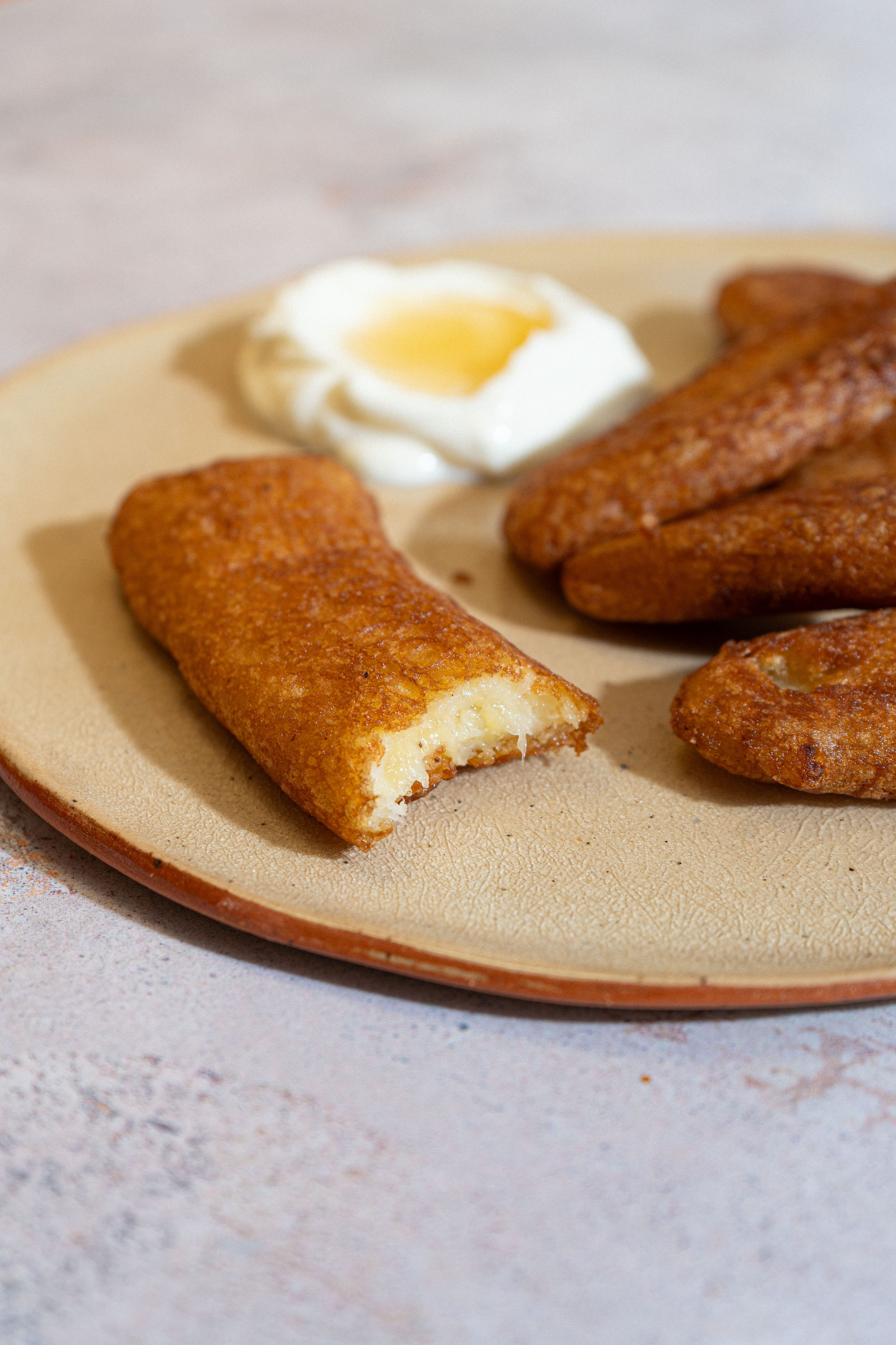 Emborrajados de Guineo with yoghurt and a drizzle of honey. A perfect snack. Recipe below.
