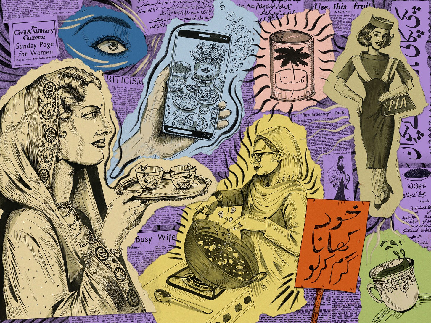 A history of Pakistani women’s cooking through the decades, by Saba Imtiaz. Illustration by Shehzil Malik
