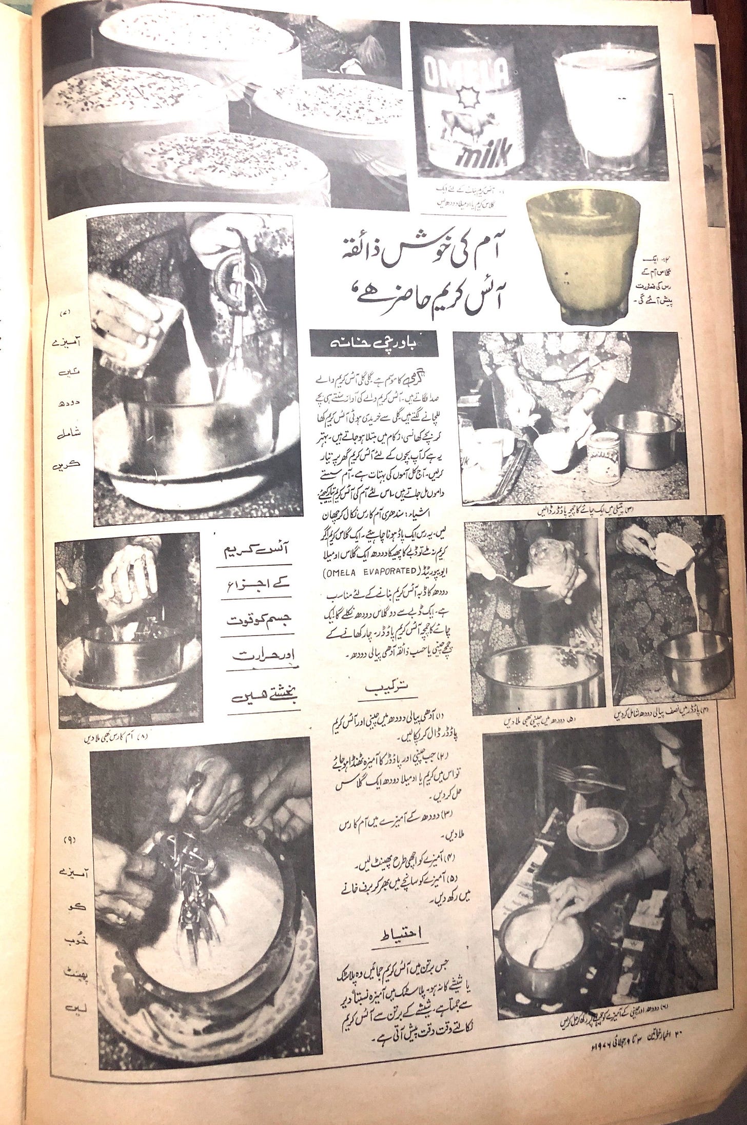 As women’s employment changed, so did the conversations about food. The recipes featured in women’s publications began to stress quickness and convenience over the hours of labour associated with traditional recipes. Take the recipe for walnut fudge cake that appeared in the Urdu language Akhbar-e-Khawateen magazine in 1971, which mentions that ‘the best quality of this dish is that it does not require baking’ because many women would only have had access to a stovetop, not an oven. Or the ‘coffee orange’ – a combination of coffee, hot water and orange juice – which appeared in Woman’s World magazine in 1967 and would probably go viral on Instagram today. There are also useful tips for cooking and hosting – for example, a recipe (possibly an advertorial) for mango ice cream in Akhbar-e-Khawateen that cautions readers not to use a plastic or glass bowl to freeze their ice cream.