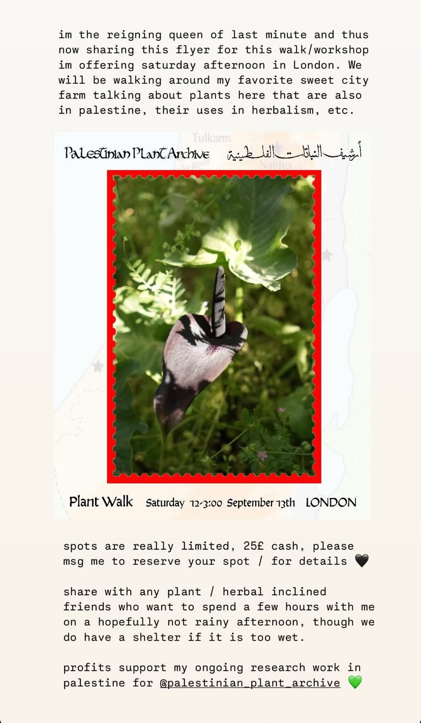 It’s been heartening to see London hospitality come out so strong in support of Palestine, with many cooking fundraisers directly raising money for food and aid agencies attempting to operate in Palestine under an Israeli blockade and genocide. There are two smaller events that I would love to promote. The first is a walk/workshop tomorrow (Saturday) on herbalism by Amanny Ahmad, who has been one of the most lucid voices on Palestine and food over the past decade (read her essay on bread, wheat and Palestine on MOLD here). Tickets are £25 – to secure one, message Amanny on Instagram (@lalph_rauren).