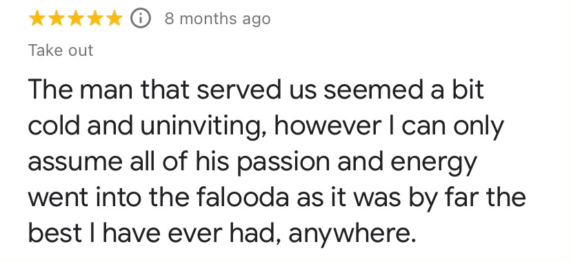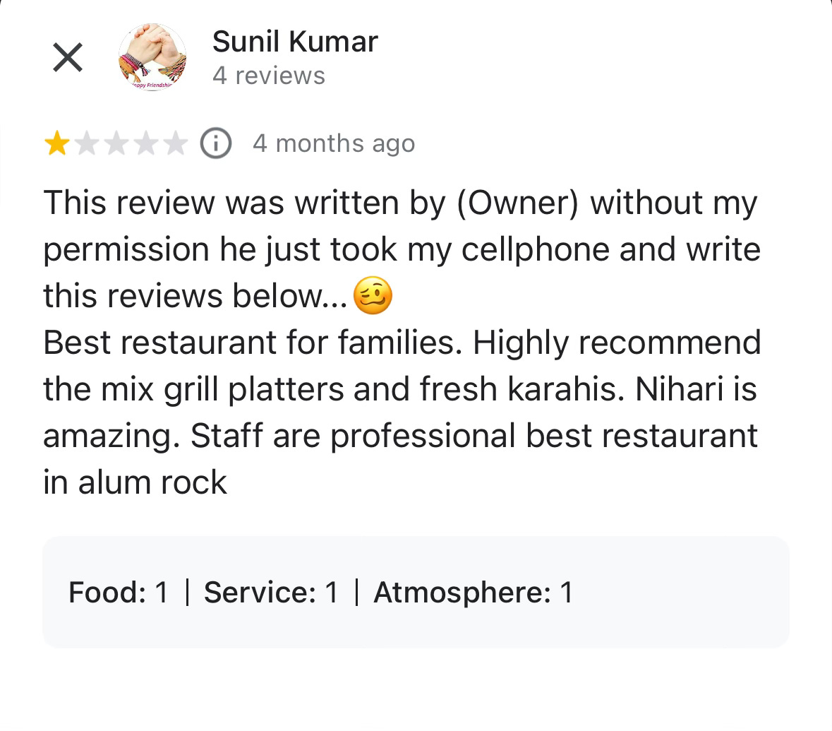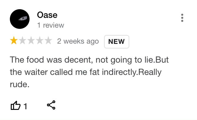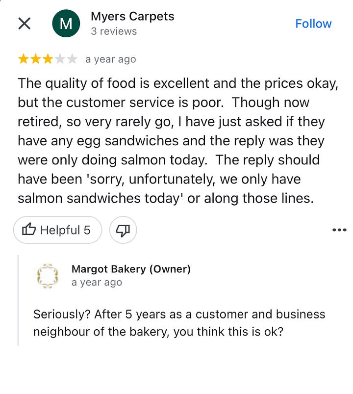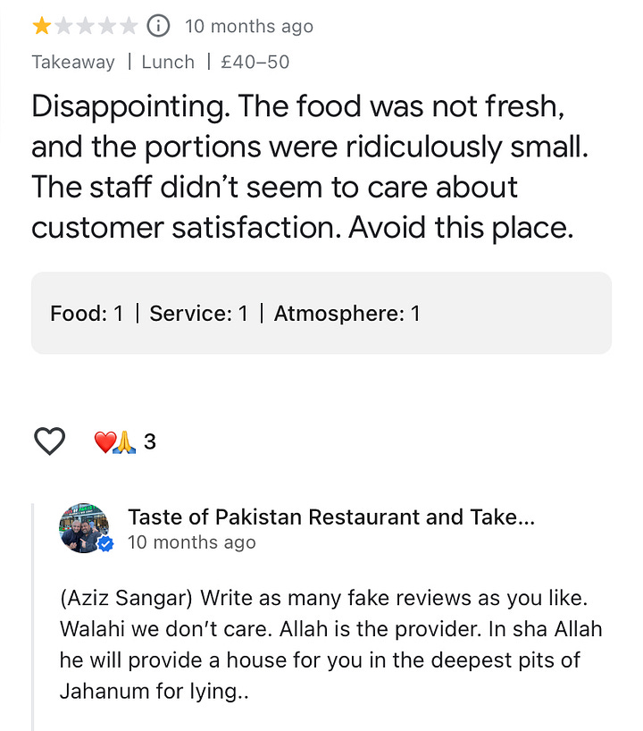 I do not think it’s a coincidence that the biggest viral restaurant story of this year (Don Ciccio closing in Highgate and choosing to go out in a fireball of anti-customer invective) and the biggest viral restaurant story of last year (The Yellow Bittern) are both, at their hearts, about wounded restaurateurs trying to navigate this new world. I have been to many restaurants that give you a QR code to their Google page at the end of a meal, sometimes asking you to do it there and then (one 4.9* rated restaurant, in Alum Rock, Birmingham, has been accused in its own review section of using customers’ phones to write the reviews for them).