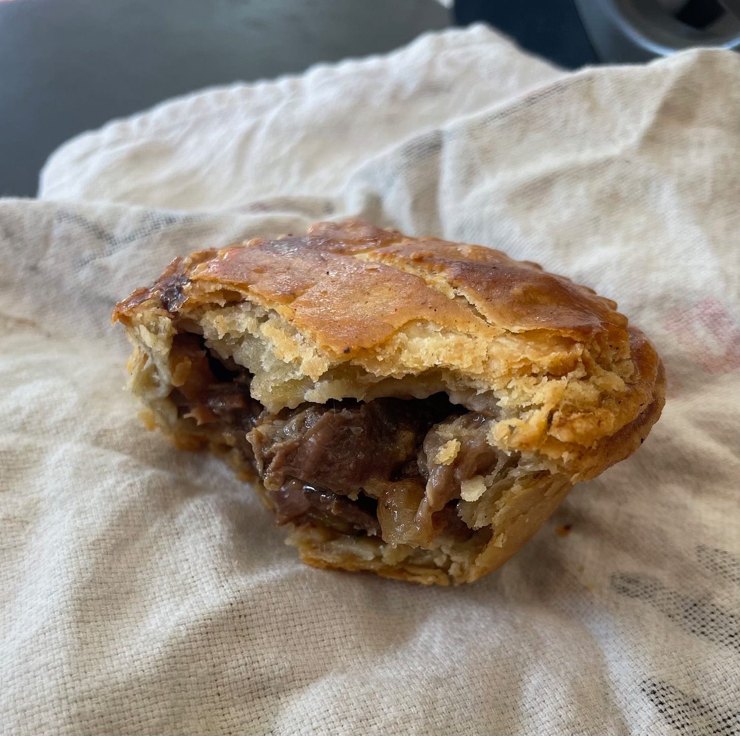 But typically my dad and I lean towards pies with a buttery shortcrust and a wine-rich steak and kidney filling. They are single-portion pies, baked in muffin trays. We make about sixty pies per funeral on average, requiring about eight kilos of filling and four kilos of pastry. We have three funerals this month. That’s a lot of pies.