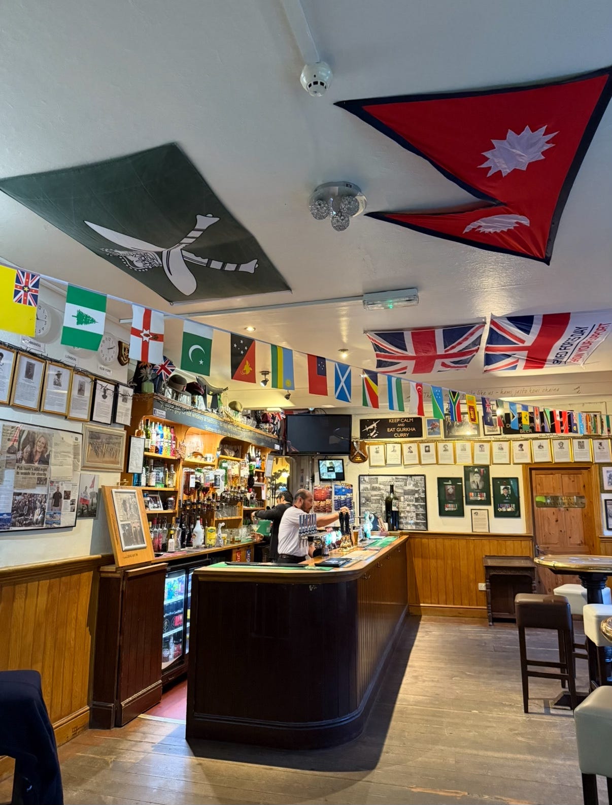 My parents have been going here for years and are in love with it. The pub section has everything you’d want from a pub in that it has the feeling of a family’s front room; walls are covered in family military photos and Gurkha regalia, there are photos of Nepal and Essex, and, of course, the royal family. Pun opened the pub in 2013 after 31 years of service, wanting to change what he saw as a fairly ‘unwelcoming’ barracks pub into a pub for everyone, families with children and dogs; a British pub that tells the story of the Gurkhas. (Colchester is home to a large British Army garrison with a sizeable Gurkha community, who settled there after gaining the right to live in the UK in the early 2000s.)