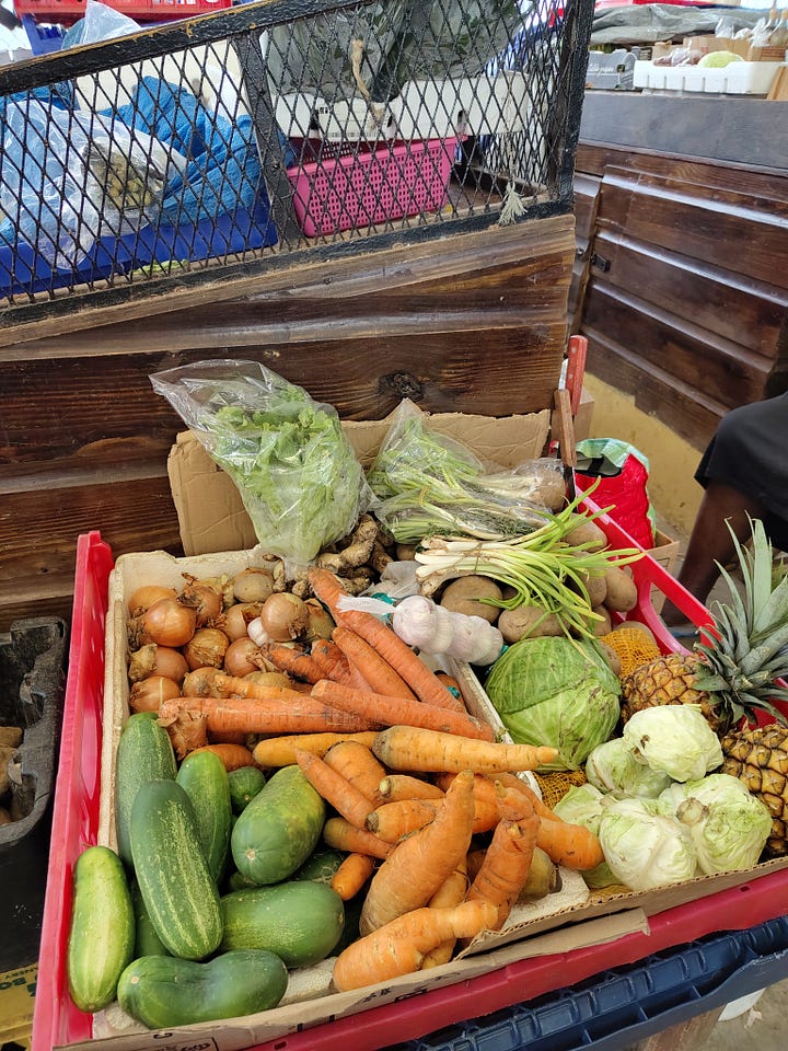 I am joined by other shoppers when I exclaim in protest at this fourfold increase, but the seller remains firm. Beside me, Bernadine, who’s selling cabbage, carrot and scallion, is watching. ‘That will all get wasted because they’re selling it for too high a price,’ she tells me, ‘and people hungry right now. It don’t make no sense.’ Since the hurricane, food scarcity has caused prices to jump: cucumbers and yams have doubled in price; carrots, cabbage and scallion have all tripled; sweet peppers have gone from $100 to $1000 dollars per pound (~50p to £5). Because Bernadine has had to increase her prices, her offering is small; she doesn’t see the point in stocking crops like country pepper that people can’t afford.