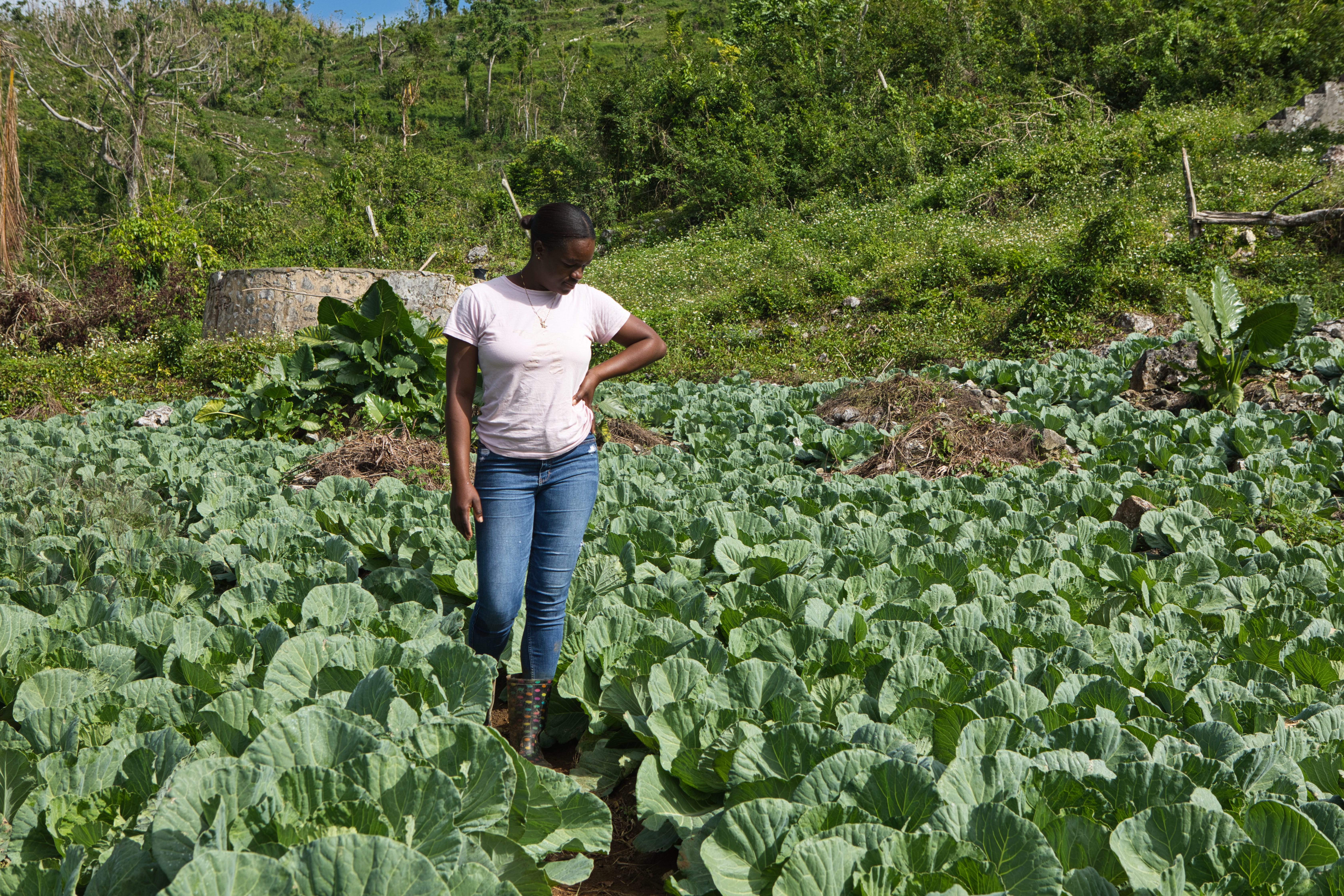 At the heart of this fragile system are farmers. A few days after I visit Bernadine’s stall, I drive to the parish of St Elizabeth – a thirty-mile journey from Hopewell that takes three hours on winding hilltop roads – to speak to Jessie, a cabbage farmer, about how she’s been recovering from the hurricane. She meets us on the roadside wearing wellington boots and a wide smile. The level of destruction is much more extreme here than in Hanover; most people’s roofs have blown off and been replaced by sheets of tarpaulin. Churches and schools are piles of rubble. Houses lie collapsed like stacks of cards, and flooding makes many roads impassable.