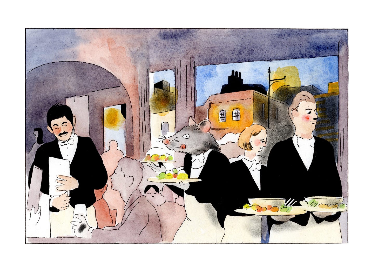I quickly became friends with another waiter, who played bass in a band I liked. We’d stand at the pass, muttering together – sometimes about music, usually taking the piss out of the customers. On my second shift, as I waited for yet another order for a Med Lamb Shish w Chips, he rushed past with a pile of plates and furtively whispered, ‘Rat behind the cutlery.’ I followed. It was oddly like cruising. Crouching in the corner, chewing furiously, he held out half a duck spring roll. I scarfed it down in one bite.