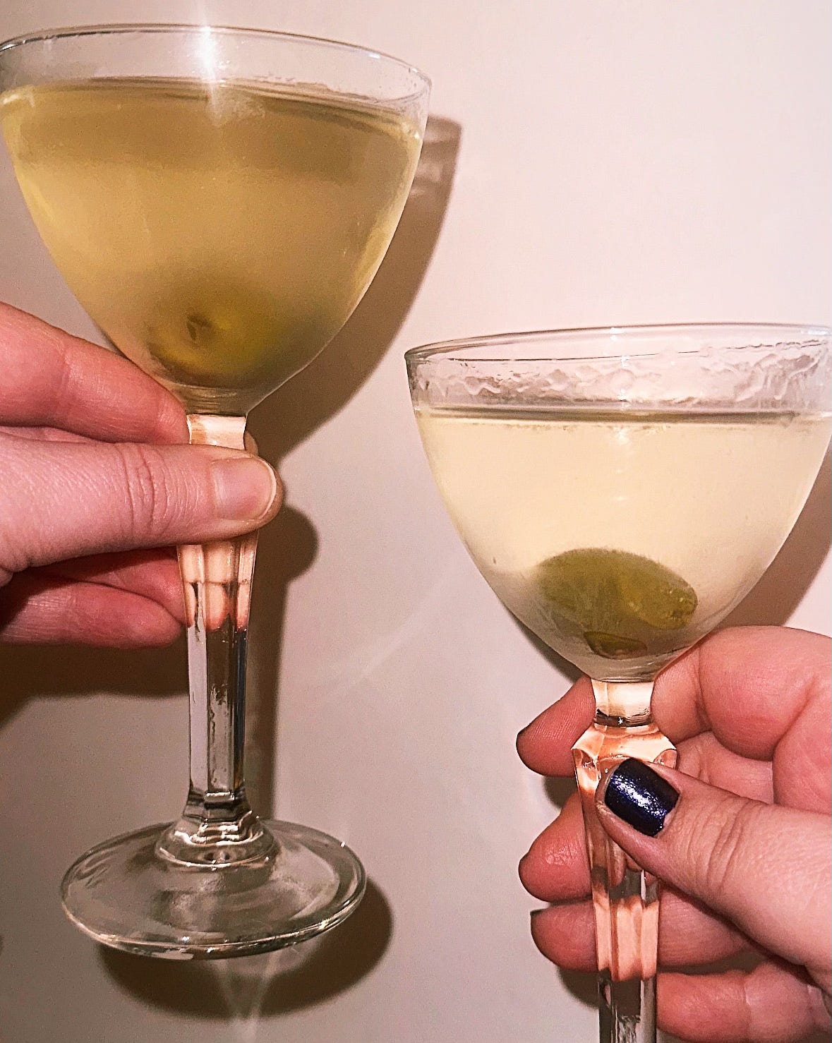 My thoughts returned to the dirty martini when Perelló olives took over the world in 2021. Bored of sticky margs, I experimented with a martini made with equal parts Perelló-infused vodka and the spicy liquid-gold Perelló brine, garnished with a single plump olive. The result was a proper slap-your-ass-and-spit-in-your-mouth kind of bev, murky as swamp water. My husband at the time declared it undrinkable, but I knew that I was on to something beautiful, and I wasn’t going to listen to a negroni-drinking naysayer. I was going to listen to Emily, a stained-glass artist and naturally blonde cockney, who said it was her platonic ideal of a dirty martini (incidentally, she still prefers her martinis mixed to this somewhat unhinged recipe to this day).