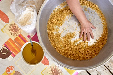 These gatherings persist to this day, with my mother still making the maftoul from scratch. When I was a child, she and my grandmother would involve all of us kids in rolling the cracked wheat and water. More often than not we would end up with clumps in our bowls rather than pearls; my mother would skillfully reintegrate our efforts into her batch and roll them into perfect little orbs. Even now, I can’t always apply the right amount of pressure to the grains (too little and they don’t roll or accumulate flour, too much and they clump up). To me and everyone around, my mother is still the queen of maftoul.