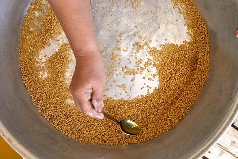 Check if the maftoul is done by tasting a few pearls – you want the centre to be cooked through but still with a slight bite. Transfer the pearls into a bowl and toss with the butter, salt, cinnamon, nutmeg, and caraway.