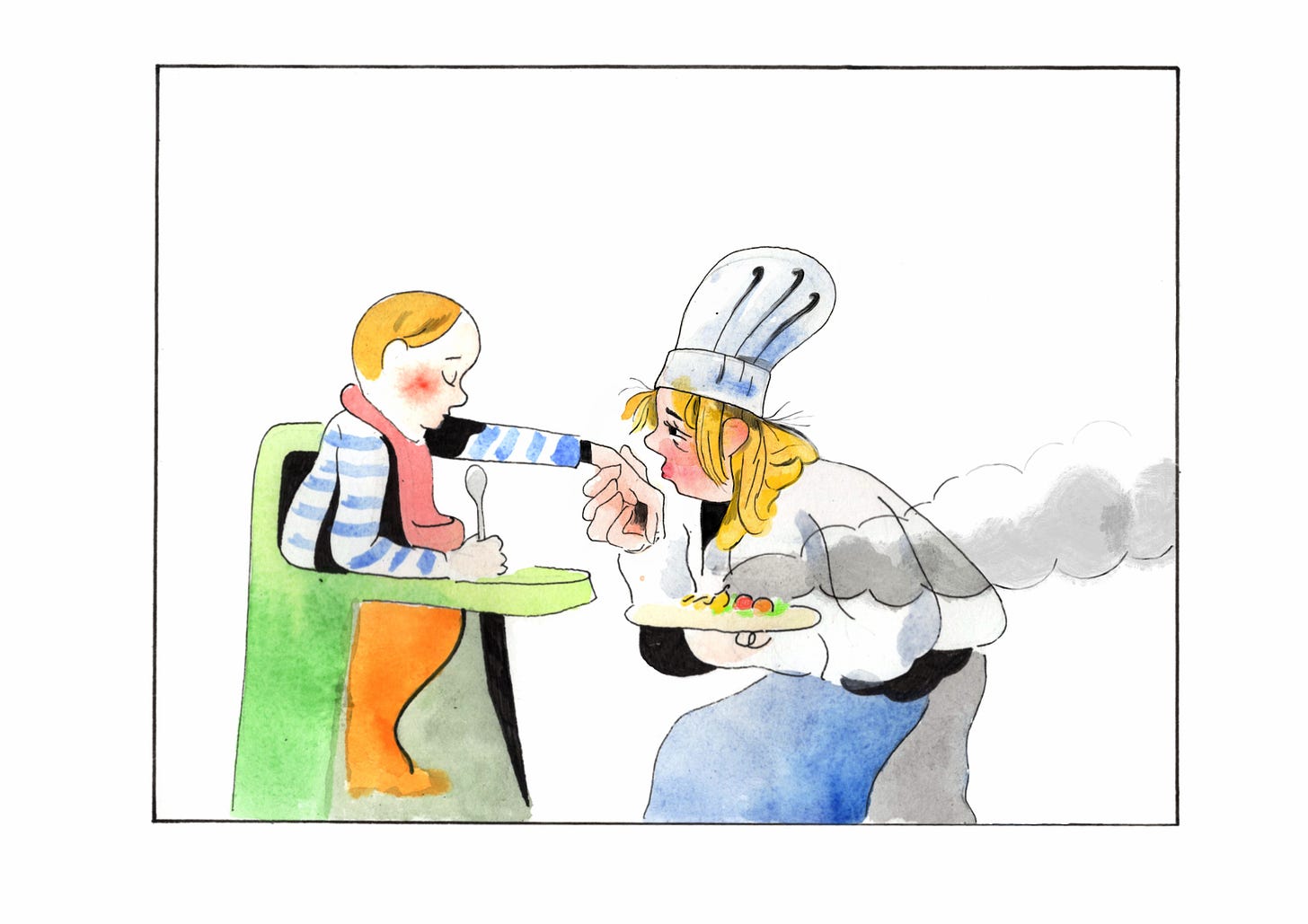 Often, while serving, I have existed on scraps. Sculptural knuckles of carrots julienned on the mandolin, fatty Marcona almonds glistening with salt, pickles alarming in their pink brine. Now: cold mushrooms. Half a fishfinger. Piles and piles of damp toast crusts. In this way our meals are shared even when I don’t sit down with you. I taste and adapt a curry, wonder about the texture of lime leaves and whether you found them off-putting. Would a chunk, a puree, a broth be more palatable? You don’t have the vocabulary to describe why something was revolting and I must simply interpret from the still-full bowl, the bits hurled to the floor, the particularly reviled thing that was chewed, spat out and then proffered to me. The thing that I opened my hand to take, for some reason. I try to understand, to not only be receptive to feedback but to pre-empt it. I try not to let you see my doubts about a plate as I am placing it in front of you. It is my job to make you trust me, to believe without question that what I offer is good.