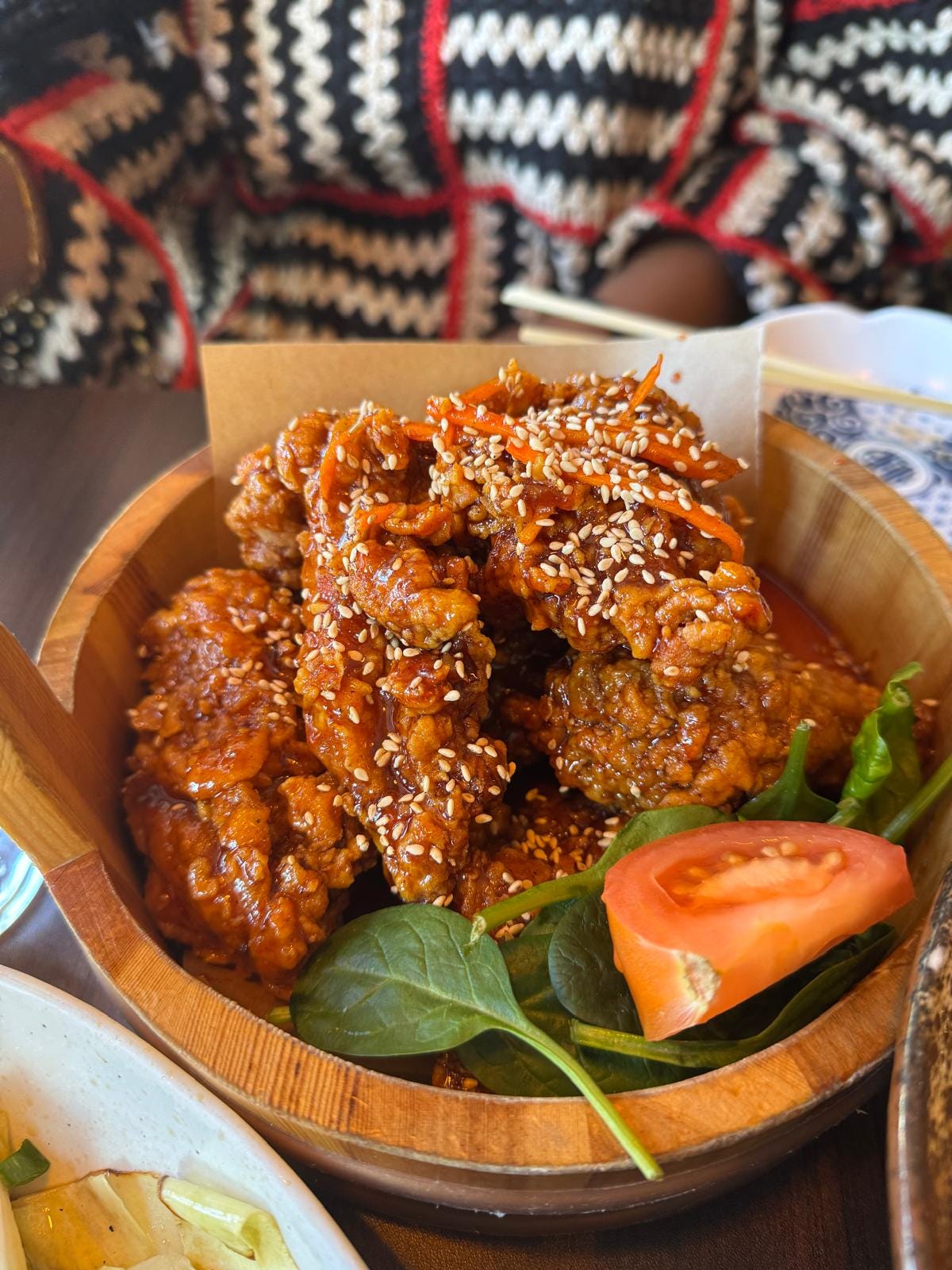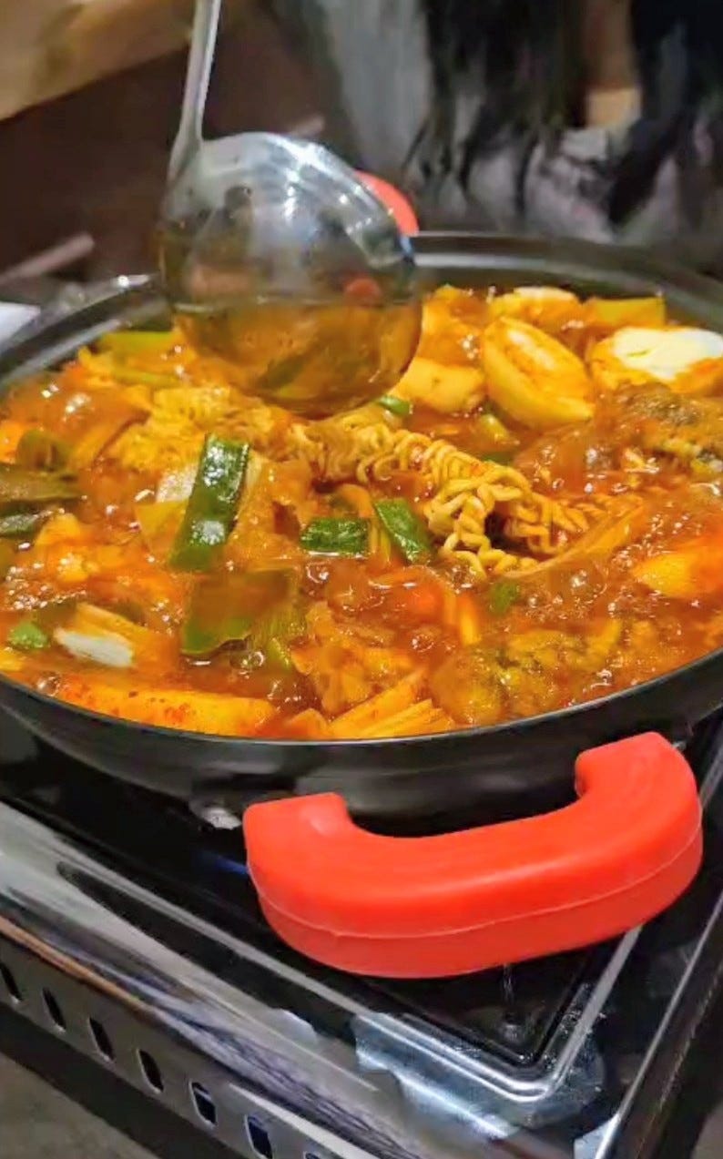 Kuma lies in the Korean belt of south London, an area filled with cosy restaurants like Jihwaja, Daebak and Taeyang Pocha, but the food there stands out – it’s a place where every dish that comes out is saltier and crispier than the last. (A crescendo is only reached once the waiter stops bringing dishes to the table.) At Kuma, surrounded by good friends, I eat freely, because the food deserves to be eaten without holding back. Plates of bulgogi arrive sizzling, heat roaring from the cast-iron plate, always tempting and habitually resulting in a burn. Buoyant rice cakes swim around seaweed noodle rolls in the glossy red sauce of the gimmari ttokboki. Chopsticks move quickly as you attempt to grab pieces of salty stir-fried izakaya cabbage.