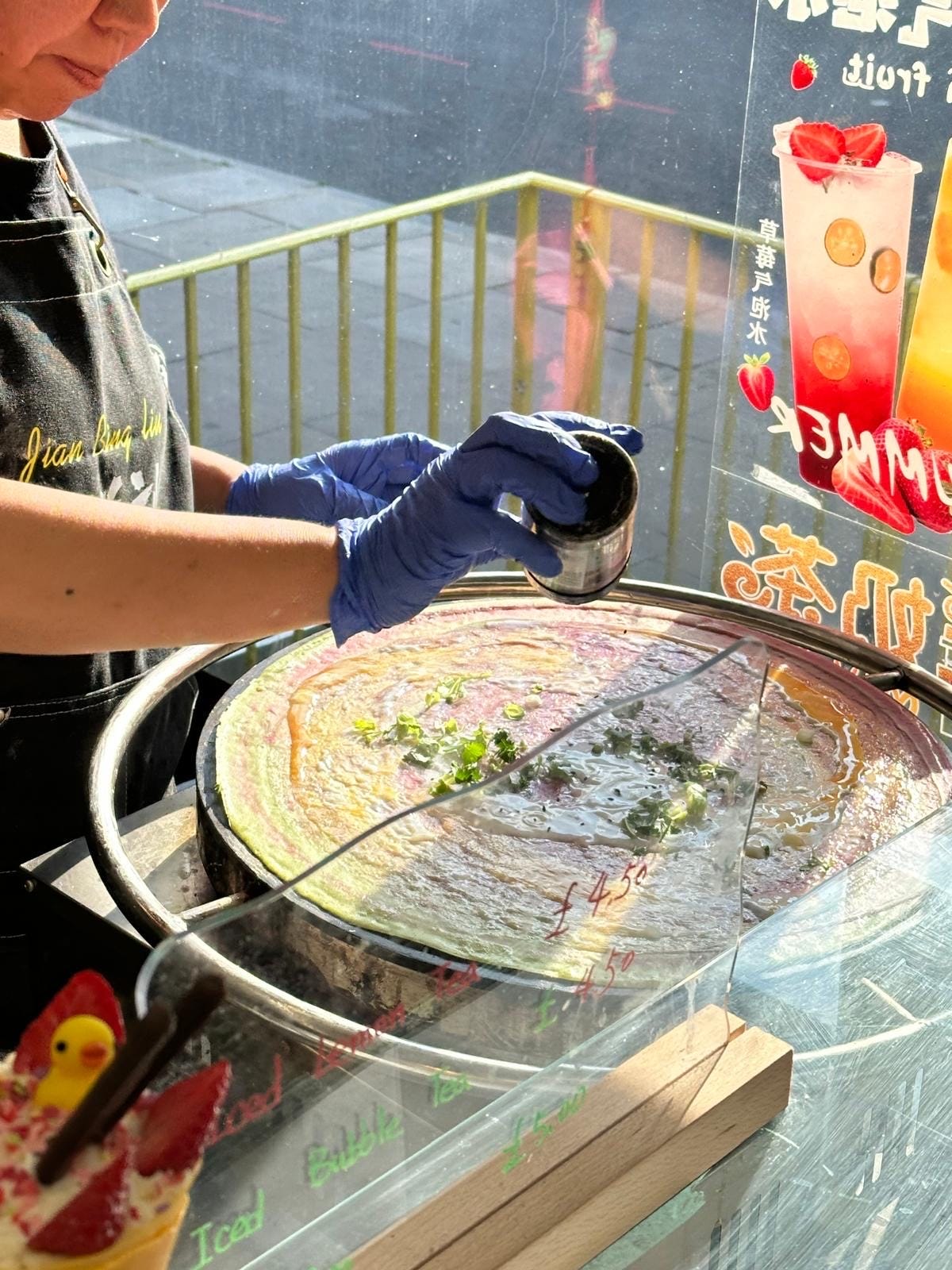 Aunty#2 nudged me with the sizzle on her crêpe. She let me choose what colour batter went in which concentric circle – like reverse engineering a rainbow. She told me under no circumstances to choose lettuce as a filling, shattering my illusions of health, and directed me towards bean sprouts. She then violently shook the five-spice seasoning into the chicken mixture, which convinced me of the vestigiality of measuring cups as a Western invention. She topped it with sesame seeds and kalonji (nigella seeds) to stop my hairfall and congratulated me for not having the cilantro soap gene. I left the shop with food for the next two days and advice for the next decade. Saira Banu
