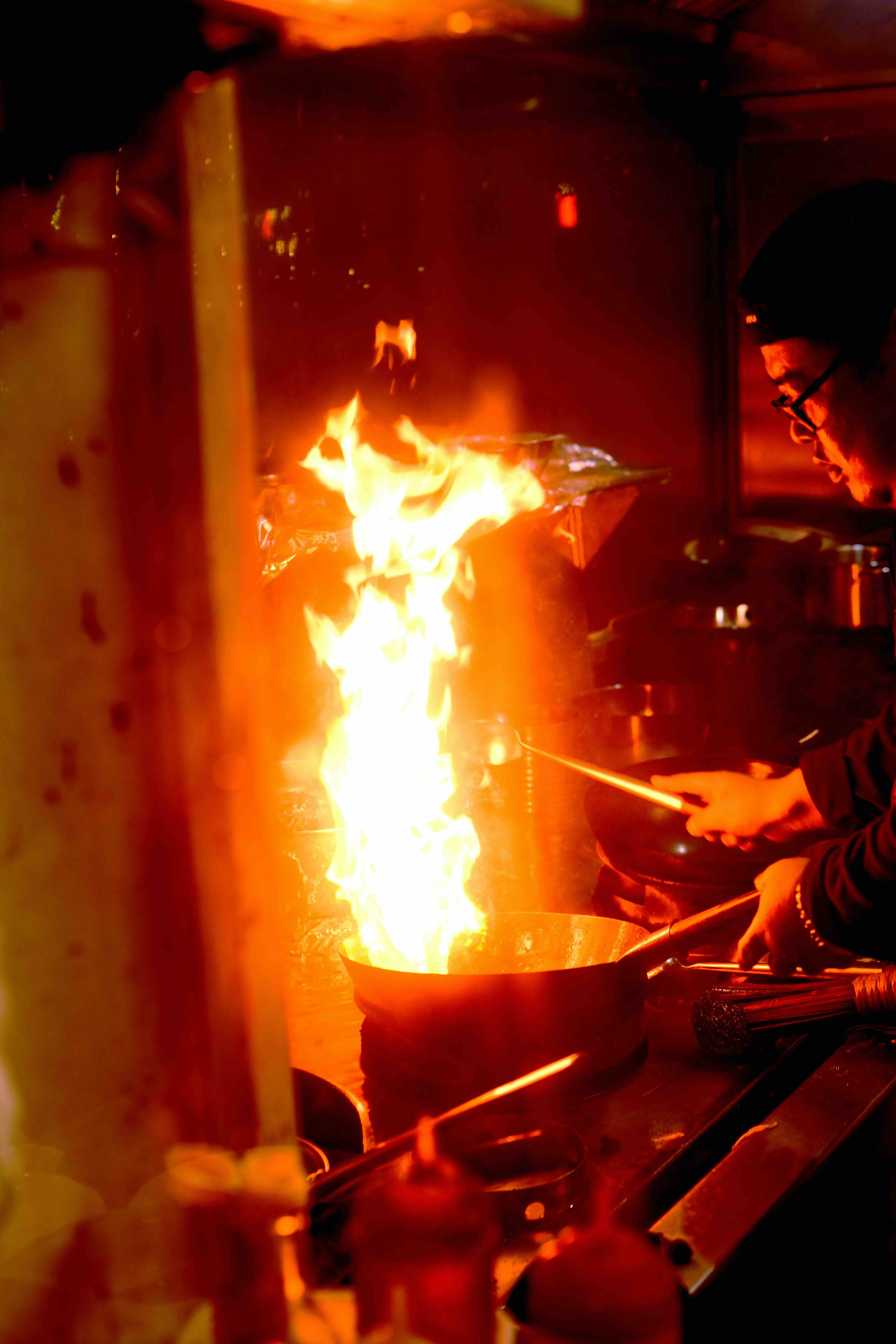 The first thing you notice at Dong Yuan is the fire. A burst of orange flame that rises above the wok before collapsing back into smoke. Through the window of a small porch extension, you can see the chef working at the burners. In one wok, he tosses the food almost non-stop, occasionally flicking the pan forward, letting the flames lick the food. Two other empty woks sit in front of him, being heated until they begin to smoke: this is the right moment when cold oil should be added so food doesn’t stick or get charred too fast. The wok hei reaches you first before the plates do: the complex, smoky aroma fleetingly cloaks the piping-hot stir-fries. The cooking here is organised around heat and momentum; ingredients are constantly sautéed, tossed and kissed by flame, with one chef simultaneously managing all three woks. Plates leave the kitchen as quickly as they enter it. Nothing here is designed to linger.