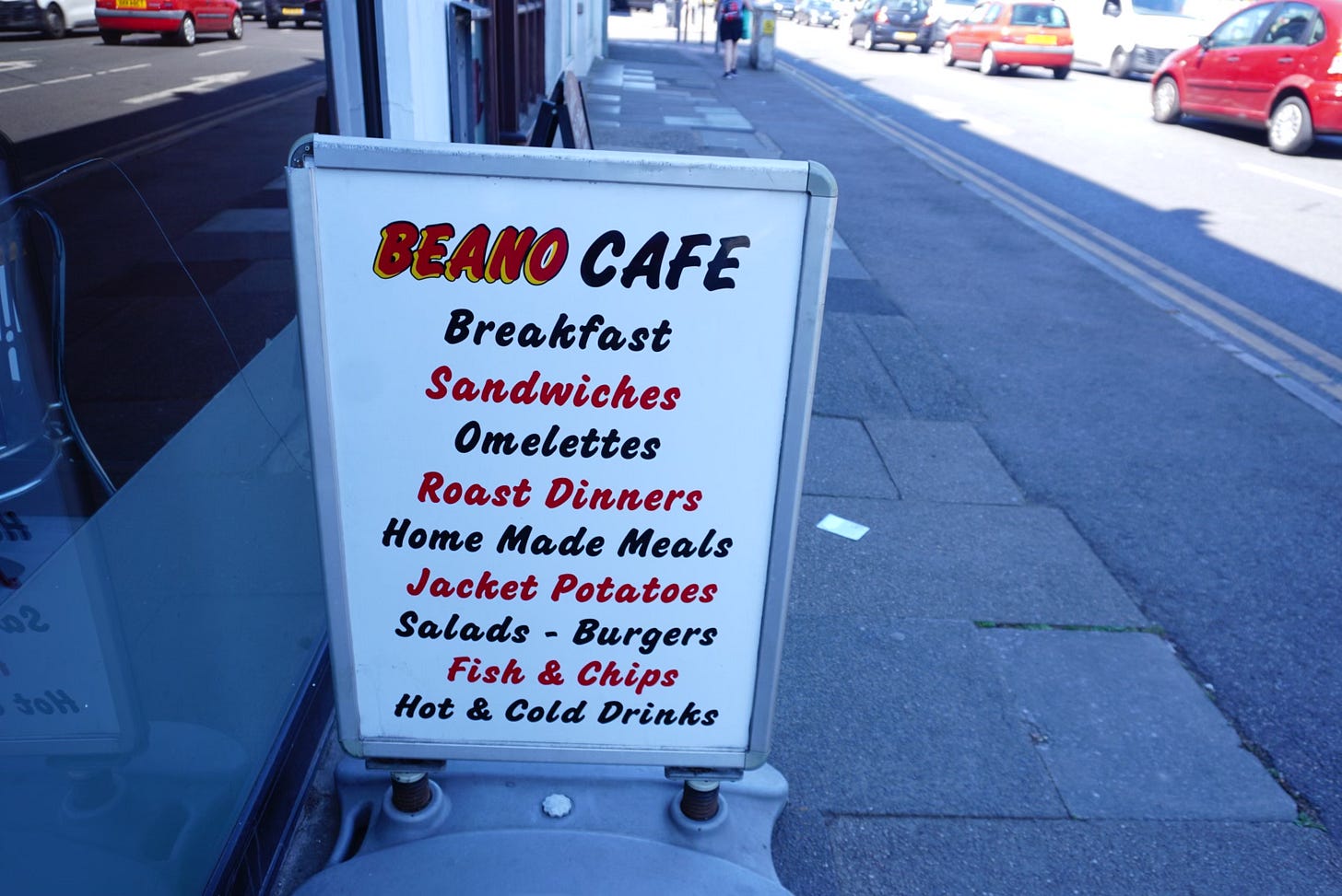 As the weeks went on, I couldn’t help but notice versions of the Beano cafe everywhere I went – from Ramsgate to Canterbury, Sheerness, Broadstairs, Folkestone and stretching as far as the London borderlands in Bexleyheath. Mr Beano Coffee Shop. The Beano. Beano’s Cafe. Beano Family Cafe. I counted fourteen variations in total, all located in Kent (or places which are at least spiritually Kent). Then there were the signs. Some with painted bold red and yellow highlights that echo the nineties comic, others with unrelated 3D lettering and chrome frontage.