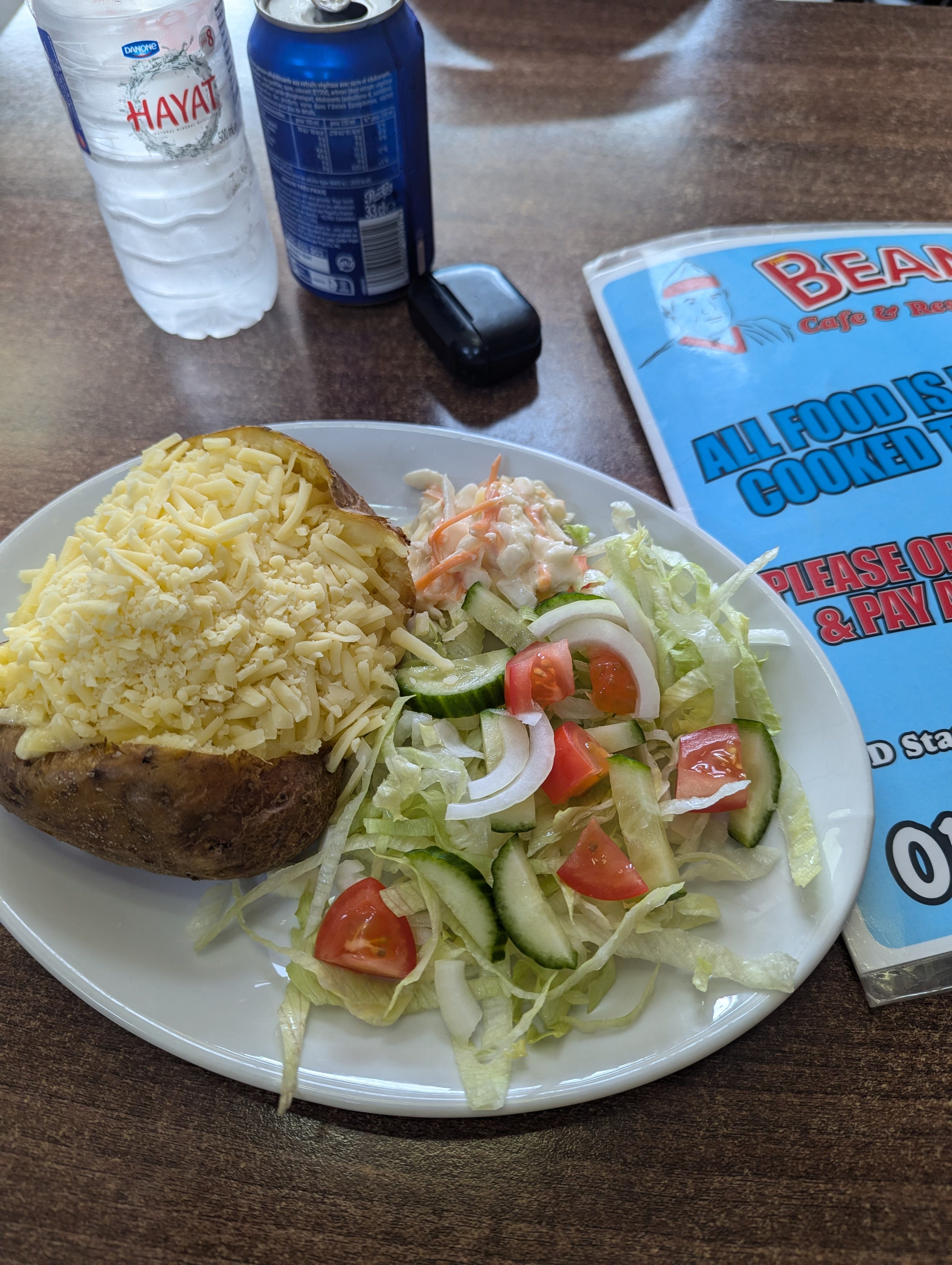 In the end, the name Beano doesn’t really matter. These cafes could have been called anything. What lingers in the mind is their enduring ability to satisfy appetites, not aesthetics. Back at the original Beano Westgate branch, I order a jacket potato for £5.50 – less than a pint at most pubs. It arrives under a heap of butter and grated cheese, which is slowly melting from the heat of the potato. Perfectly crisp on the outside, fluffy on the inside. Shredded iceberg, onion and half-moon tomatoes take up half of the plate, with a dollop of coleslaw for good measure. It takes me back to visiting cafes with my mum in Wales as a child and polishing off jacket potatoes in the same fashion (funnily enough, my order at Ocky White’s cafe in my hometown of Haverfordwest was also called ‘beano’). I look around at the tables filled with chatter from three generations of families, hear the familiar clink of cups and saucers and the hiss of the coffee machine. I lift my knife and fork, and tuck in.