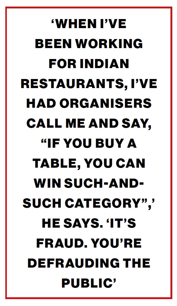 Suri is coy when I mention awards, such as the Oceanic ones, which don’t judge food themselves. ‘These [awards] are just business,’ he eventually admits. However, when I ask Shaw how much the Asian Curry Awards cost to attend, he deflects and tells me he’s not in charge of ticketing so, like almost everyone I’ve spoken to, cannot confirm prices. But he isn’t surprised by what other award organisers charge, and tells me something that goes further than anything I’ve heard so far. ‘When I’ve been working for Indian restaurants, I’ve had organisers call me and say, “If you buy a table, you can win such-and-such category.”’ he says. ‘It’s fraud. You’re defrauding the public.’