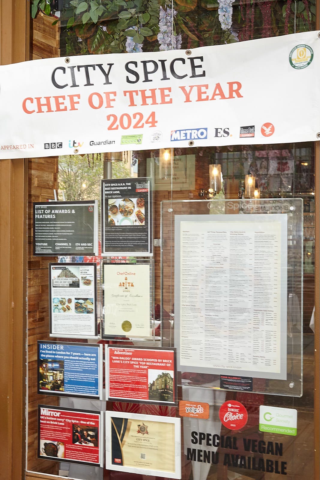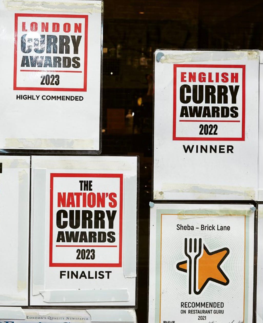 As I walk past more restaurants, more awards appear, stuck in doorways and windows at eye level. If you are the kind of diner who chooses where to eat by peering into restaurant windows, this walk can be baffling. How is it possible that there are so many feted restaurants in one small space, each one claiming to have won the highest honour curry awards can bestow? Within 160 metres there are eighteen restaurants, with fourteen proudly displaying awards, including ‘Asian Curry Awards 2022 – newcomer of the Year’ at Brick Lane Tandoori, ‘Curry Chef of the Year, 2023 awarded by JJ.com’ at Preem Indian Restaurant, ‘British Bengal Curry Awards 2022’ at Cinnamon, ‘London Curry Awards winner, 2023’ and ‘English Curry Awards winner, 2022’. Sometimes it feels like there are more awards than customers.