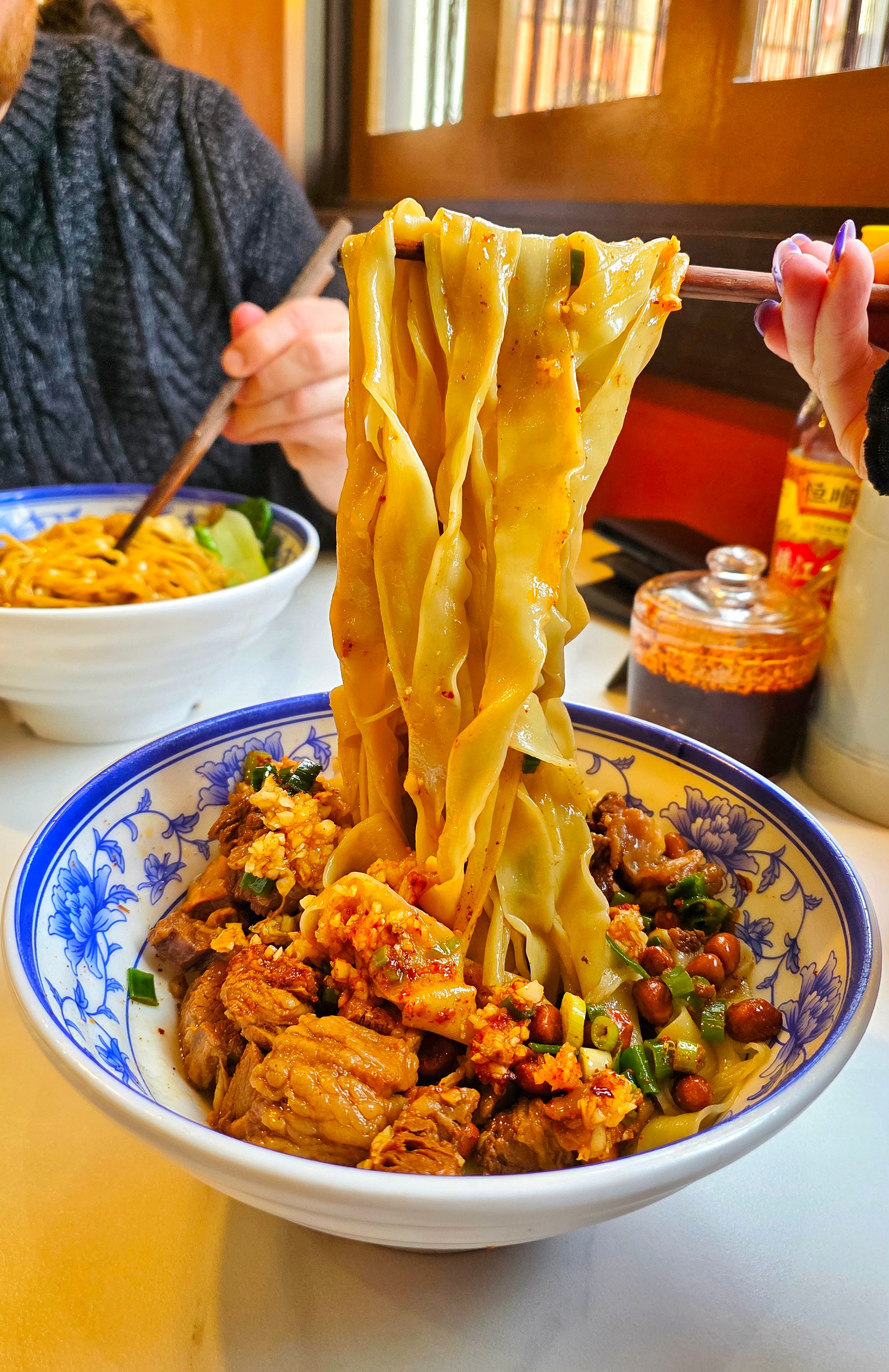 At Noodle Plus, the draw is right there in the name, and in the window. Watch as the noodle master effortlessly stretches and slaps dough into long, elastic ribbons, a hypnotic ritual of skill and strength that never fails to gather onlookers. He’s bounced around several noodle joints across the city, but wherever he goes, the masses follow. Choose from Lanzhou hand-pulled noodles with plenty of bite and bounce, Shaanxi knife-cut noodles or biang biang belt noodles, which are then plunged into broth and served steaming. The braised beef brisket is the local favourite, rich in five-spice and soy, generous in portion and layered with warmth. Affordable, filling and utterly satisfying, this is no-frills comfort food elevated by craft and best enjoyed with lashings of chilli oil.