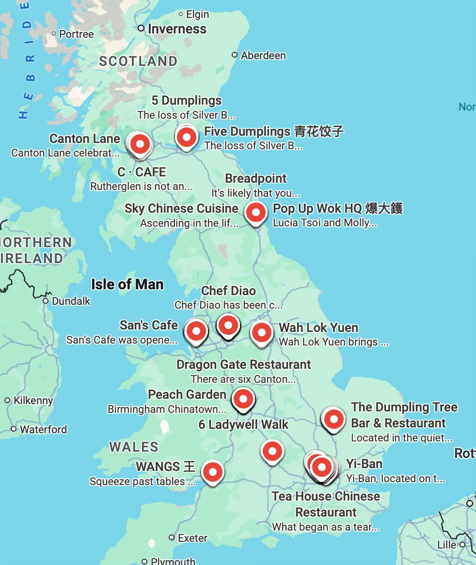 Birmingham, Bristol, Cambridge, Edinburgh, Glasgow, Liverpool, London, Manchester, Newcastle, Oxford, and Sheffield - more than 150 recommendations for Chinese restaurants.