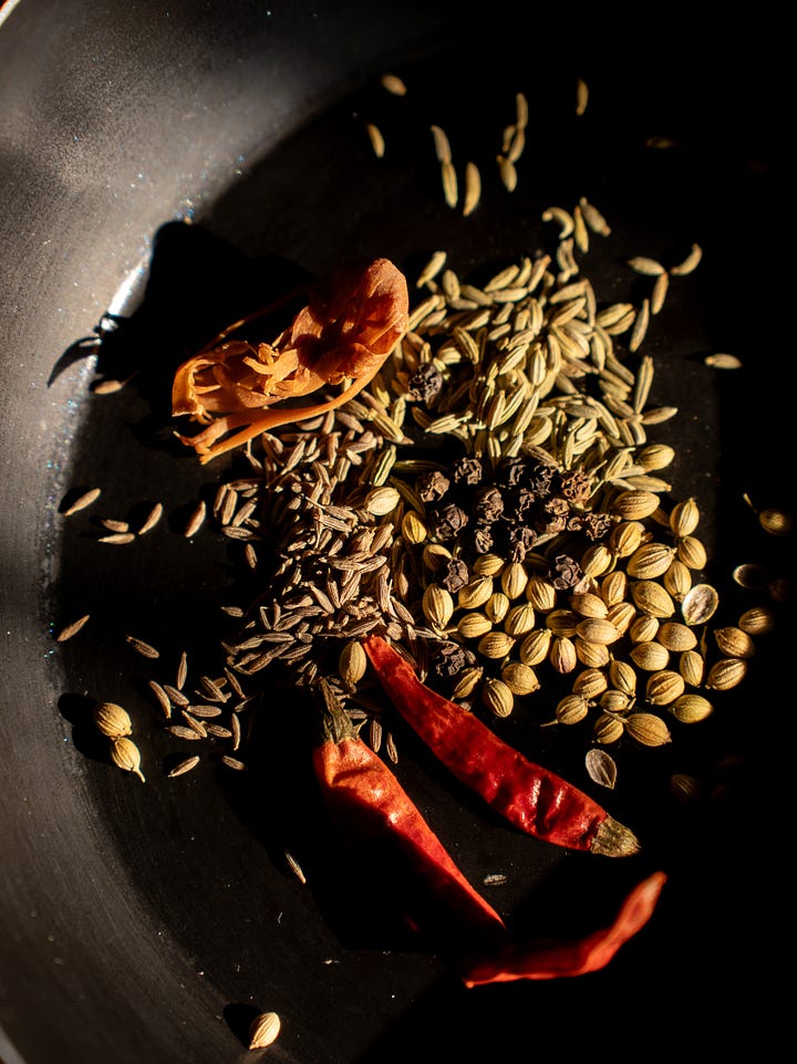 Capitalism tells us that there is a ‘correct’ way to smell of spices – after all, many expensive perfumes contain notes of cinnamon, black pepper and ginger. But I am more interested in the ‘wrong’ way, in undoing the decades’ worth of shame that I have carried about the smell of the food I love to cook and eat. This recipe is the embodiment of that resolution. When I make this dish, I deliberately leave all the interior doors in our house open. Afterwards, I enjoy sinking into sheets that carry the scent of ginger and lemongrass and fennel and ghee.