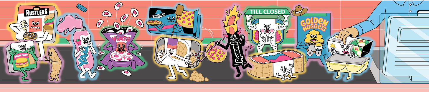 In many ways, Bad Food feels like our first issue. It is the first magazine we have commissioned entirely as a whole item and feels very much like us: a reflection of our love for the more absurd, stupid and evil parts of food culture. If you’re interested in mould, Maggi, monosodium glutamate, aspartame, Ace K, Irn Bru, dupe sodas, Richmond Sausages, Rustlers Burgers, Charlie Bigham, Red 40, E numbers, E coli, the oeuvres of Pierre Bourdieu, Simone Weil and Gregg Wallace, Sosmix, post-orgy roast dinner buffets, sploshing, squat slop, creamy cheese szechwan dosas, Massimo Bottura, Massimo Dutti and the worst three-star restaurants in the world, then this issue is for you.