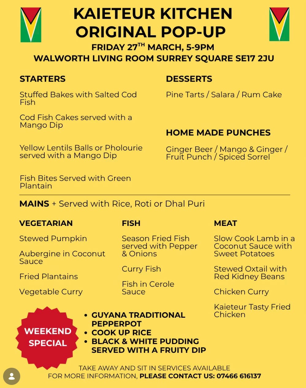 A quick reminder that Faye Gomes at Kaieteur Kitchen is cooking at Walworth Living Room from 5-9pm tonight, after being evicted from Elephant and Castle last year. If you’ve enjoyed her food, please go and support her - you can find the menu below.