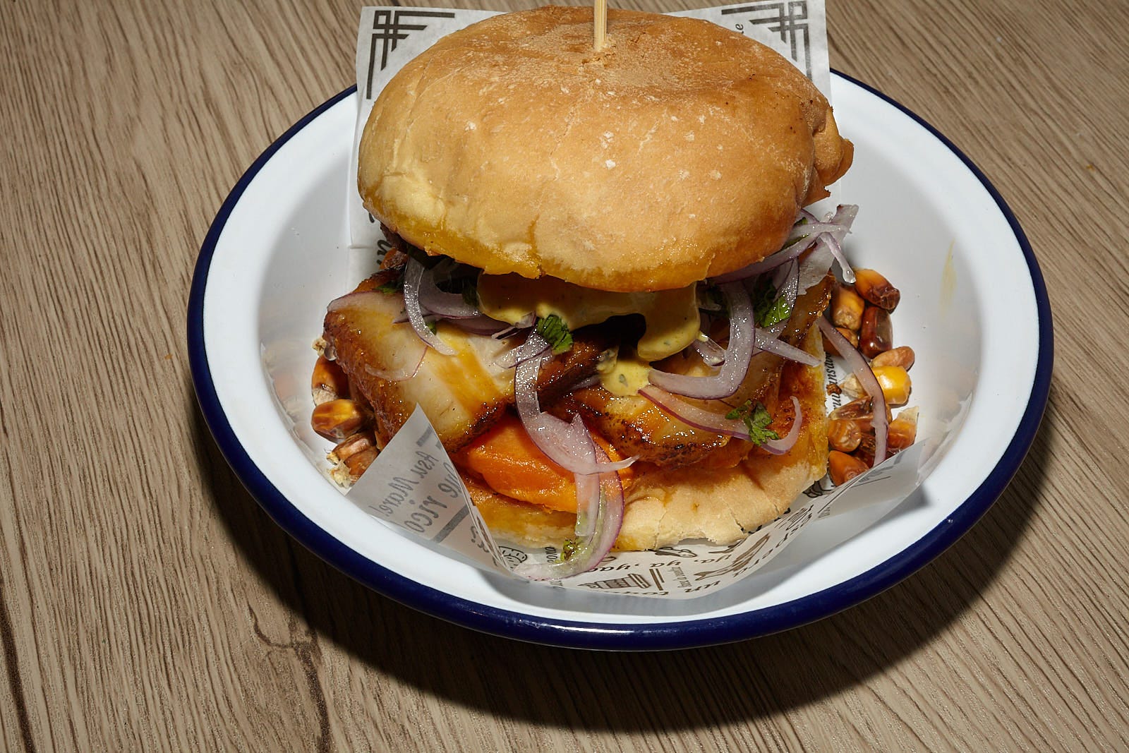 “Held together with a BFG’s toothpick, it contained an unruly landscape of pork belly sliced and fried to ragged umber arches, yielding slabs of sweet potato and an acidic backcombed pile of red onion. All of it is bathed in the sunlight of an ají amarillo sauce that tastes like the ghostly sister to a passionfruit. This is the kind of sandwich that’s so much better than it needs to be”