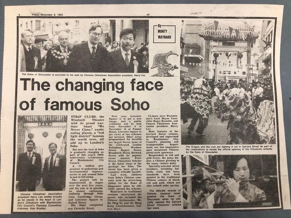 Westminster City Council allocated around £235,000 for the Chinatown ‘facelift’ project according to a local news report (see image). The project included building three archways, installing a selection of street furniture and bilingual street signs, and pedestrianising the main streets. In 1986, Peter Levy (son of Joe Levy, a key figure in London’s 1960s property boom) and Jonathan Lane made their first property purchase in Chinatown, laying the foundations for the company that would become known as Shaftesbury Capital (which, as of late 2022, owns around 80% of the area, including forty-three shops and ninety-eight food and drink businesses).